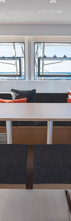 The twin helm stations are positioned at the stern for a direct connection to the rudders, offering a pure sailing experience inspired by monohulls. This layout ensures unmatched visibility and immediate sail trim adjustments.