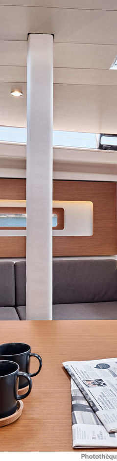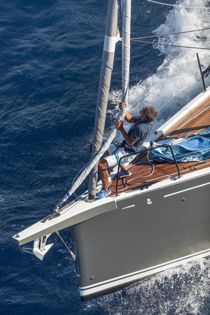 The BENETEAU First 44 has been thoughtfully designed with two distinct deck layouts to meet a wider range of sailing preferences. The First 44 cruising version features a spacious and inviting cockpit, where wide side decks flow seamlessly into a central folding cockpit table—ideal for both comfort and functionality. Equipped with four winches, a fixed centerline mainsheet block, and an aft-positioned mast, the deck layout is optimized for performance, enhancing the efficiency of a modern sail plan characterized by a tall, slender mainsail and generously sized foresails.